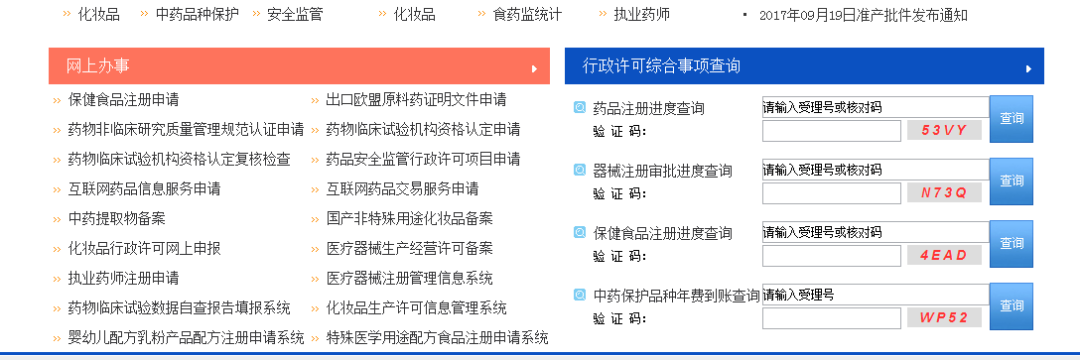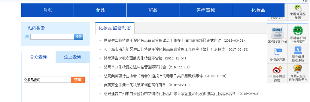 首先,点开国家食品药品监督管理总局的官网http://www.sfda.gov.cn/WS01/CL0001/,可以看到右侧有化妆品一栏。