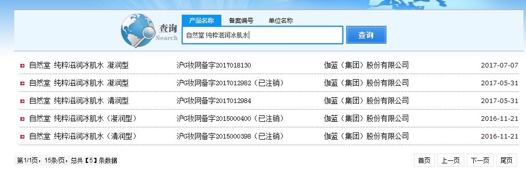 在非特殊用途化妆品服务平台上搜索“自然堂 纯粹滋润冰肌水”(注意这里的空格),则可以看到5条信息。