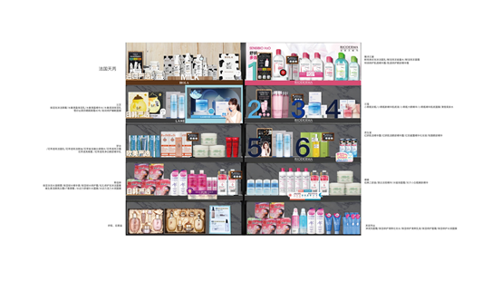 以此类推,我们可将大众名品中的补水保湿、轻度紧致、美白模块,顾问式护肤中针对油性肌肤,干性,混合型肌肤的补水保湿、美白等模块按相应功效、价位进行排序。美妆工具、日用生活品、母婴区、男士区、应季区、香水区等的具体板块,也可依照上述原则进行陈列。