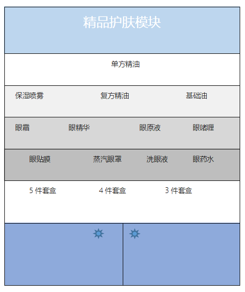 我们且折射至整个门店的商品结构,多数门店都涵盖有两三千,甚至三四千个SKU,依照品牌的人群、价格、功效定位划分,有些条码是相互重合的,这就要先依照“商品模块”进行一一梳理,确保每一个分类都有单一对应的品牌和产品。