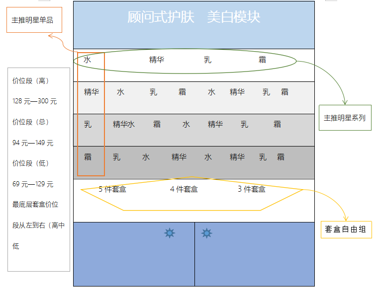 以护肤品为例,贺恒徳建议终端跳脱出品牌背柜的固有陈列,根据水、精华、乳、霜的使用步骤,以重点口碑产品凸显原则,在货架最中间位置放该类别的主推明星单品。再根据价位梯段,比如190-360元高档,160-245元中档,90-159元低档,按单品牌成套陈列。最下端则又可根据不同品牌的产品自由组合,从左到右依次以高中低价位摆放。