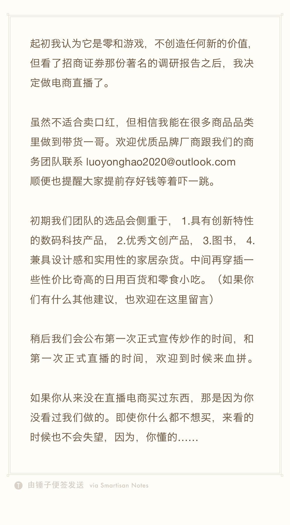 虽然不适合卖口红,但相信我能在很多商品品类里做到带货一哥。欢迎优质品牌厂商跟我们的商务团队联系luoyonghao2020@outlook.com顺便也提醒大家提前存好钱等着吓一跳。