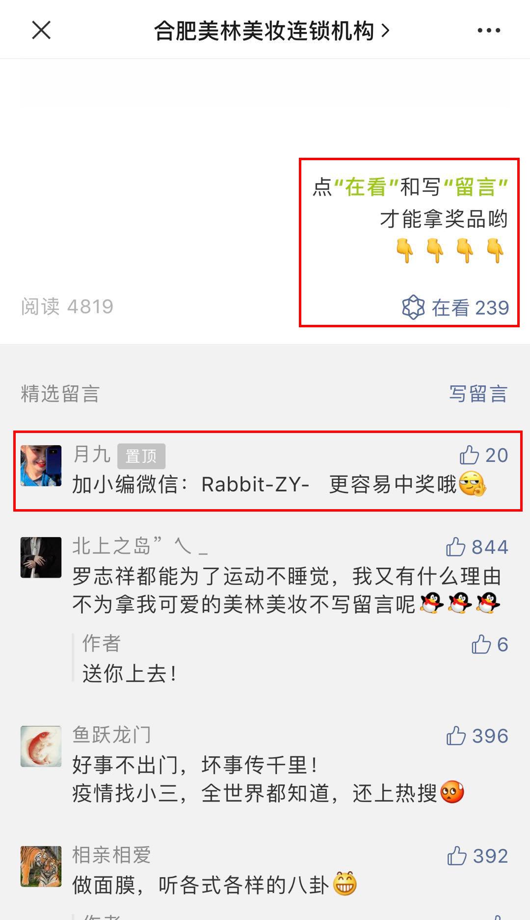 美林美妆:其服务号“合肥美林美妆连锁机构”推文更新时间在一周左右,且内容较多,包涵好物分享、直播引流、产品秒杀等,同时也会有一些热点文章的转发。在粉丝互动方面,美林美妆以话题式展开,用奖品刺激用户留言、转发和分享,另外“加小编更容易中奖”巧妙地将公众号中的用户沉淀到微信中。