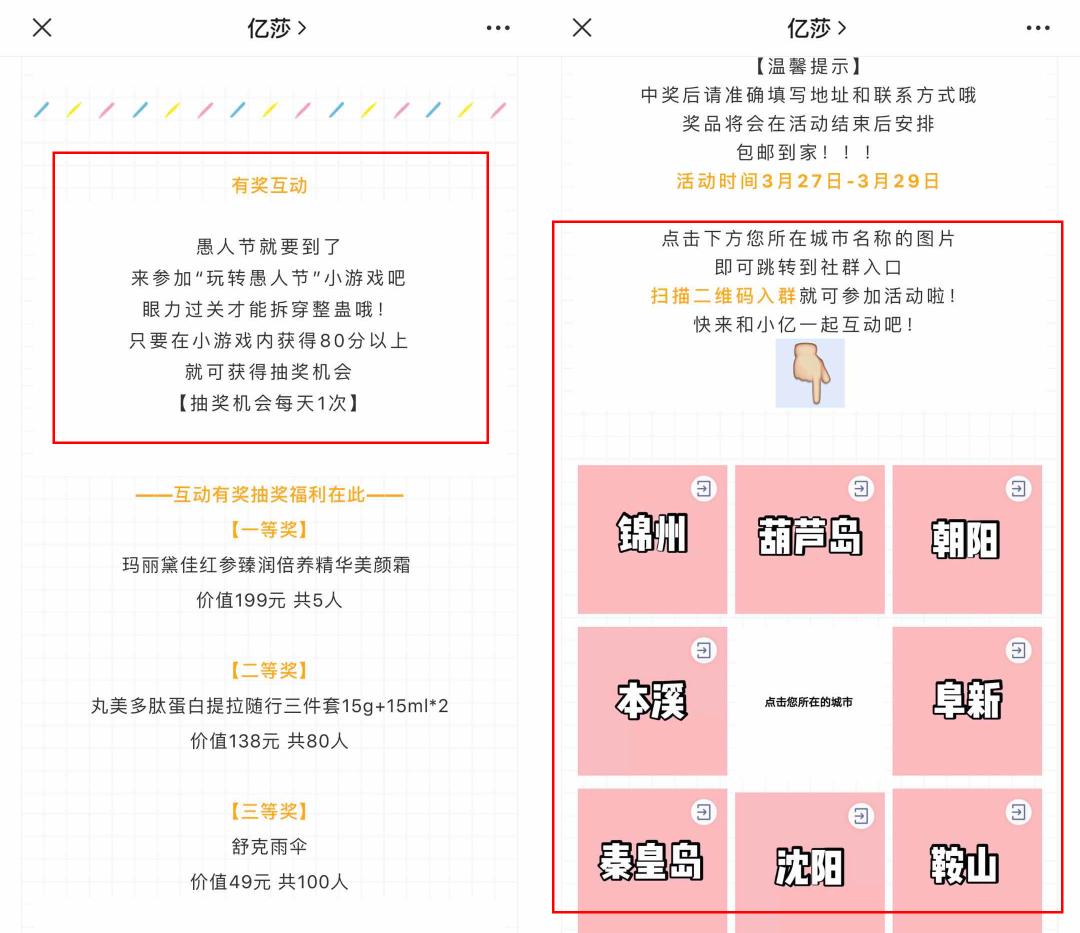 亿莎:“亿莎”服务号的更新时间大致为一周一次,推文内容主要以官方直播的引流为主,并对直播内容进行宣传,同时也包含好物推荐和部分特价产品的秒杀,在粉丝互动方面主要以游戏的形式为主,并有各个地区的社群二维码,方便用户进群。