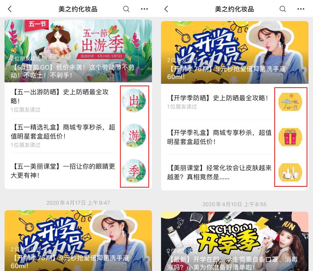 千色店:千色店服务号的内容更新周期为一周或两周,内容聚焦于微商城内产品的介绍和折扣,并附带微店链接,实现成交闭环,同时,在文章下方有微信二维码,并以优惠券的形式鼓励用户添加。另外,“千色店”在文章头图方面选择较随意,同一张图片用过三次推文,极易在用户内心造成审视疲劳。