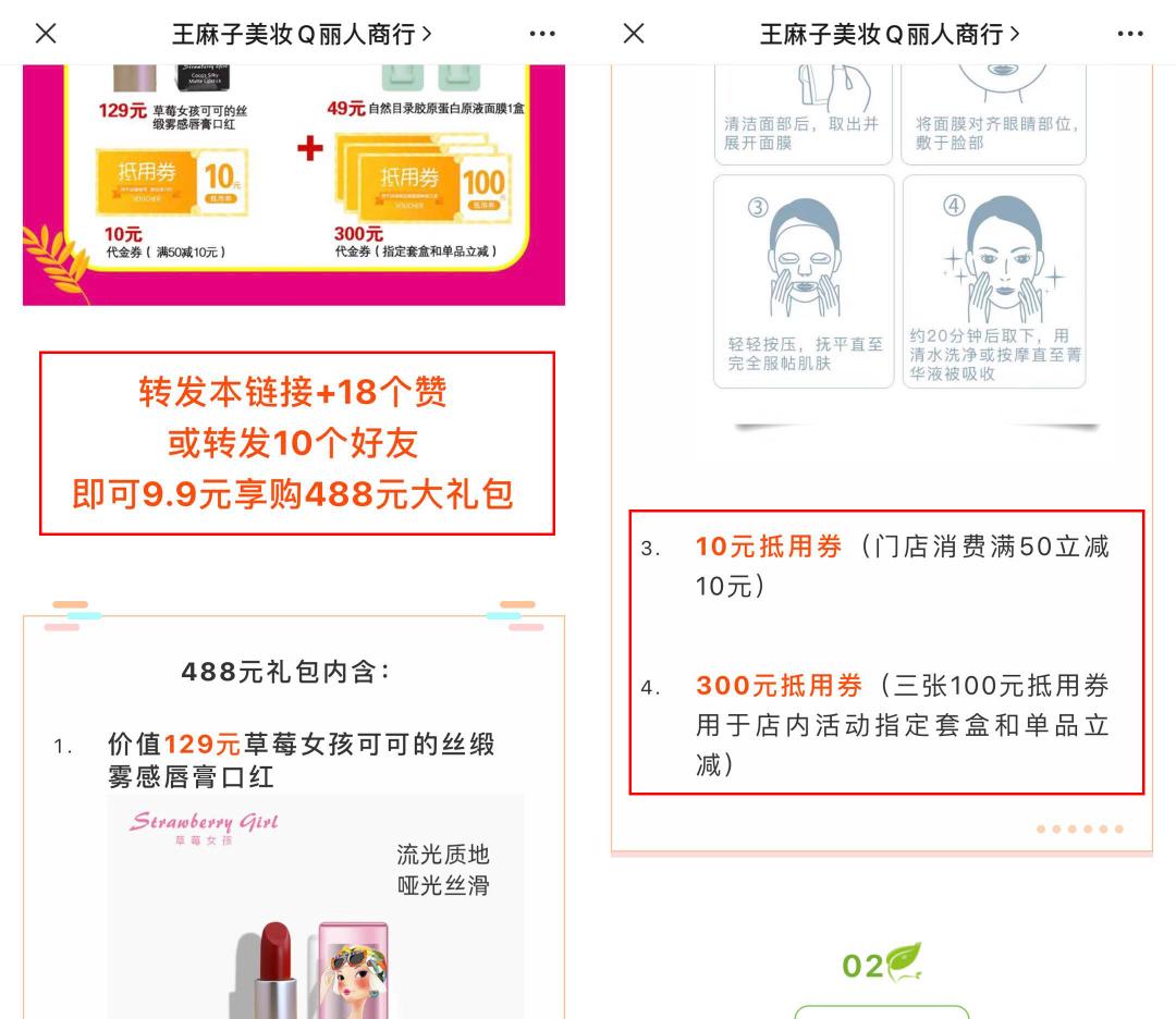 王麻子美妆:服务号“王麻子美妆Q丽人商行”在推文的更新时间上不固定,甚至有长达2个月未更新的情况,内容则以官方直播和活动预告为主,值得一提的是,其在分享裂变过程中采用转发集赞或点对点推送的方式,且奖品包含产品和抵用券,能够促进用户进店消费。