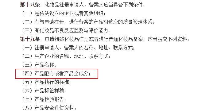 《新条例》第十九条规定,申请特殊化妆品注册或者进行普通化妆品备案,应当提交包括产品配方或者产品全成分、产品检验报告、产品安全评估资料、产品执行的标准、产品标签样稿等在内的8项资料。