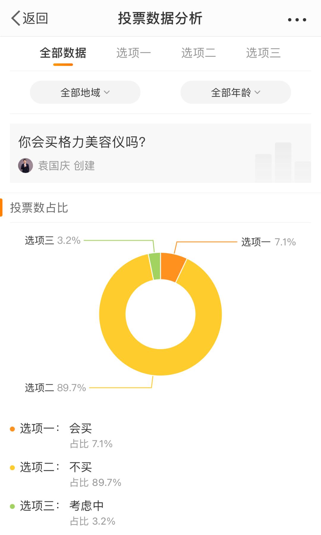 微博某互联网科技博主发起“你会买格力美容仪吗?”投票,共有1667人参与投票,其中只有119人明确会买,占比7.1%,近90%的人选择不买,可见网友的坚定立场。