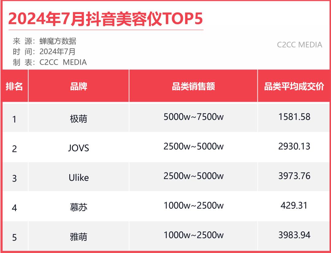 据蝉魔方显示,7月抖音美容仪TOP5中,品类平均成交价均不超过4000元,最高为雅萌的3983.94元,最低则为慕苏的429.31元。显然,格力微电流美容仪的价格远超平均水平。