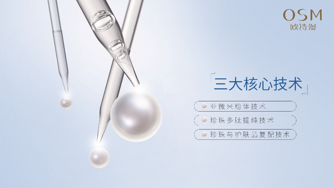 近年来为迎合年轻消费者市场,欧诗漫在产品技术上同样做出了突破型的转变,围绕珍珠美肤的核心不断革新科技。独有的三大先进核心技术——亚微米粉体技术、珍珠多肽提纯技术、珍珠与护肤品复配技术,能够将珍珠中的天然美肤活性成分融入护肤系列产品中,让肌肤享受珍珠的呵护,以高端科技收获了消费者的喜爱。