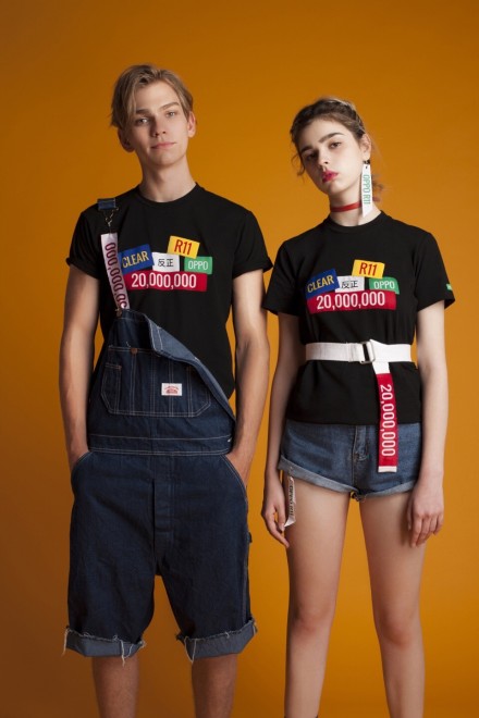 近日OPPO联名中国新锐设计师王天墨推出一件官方设计师联名T恤,黑底上贴着oppo新款手机R11相关的元素彩色织标,如200000000、clear、“反正(都精彩)”等,还附带可做腰带或耳饰的飘带。