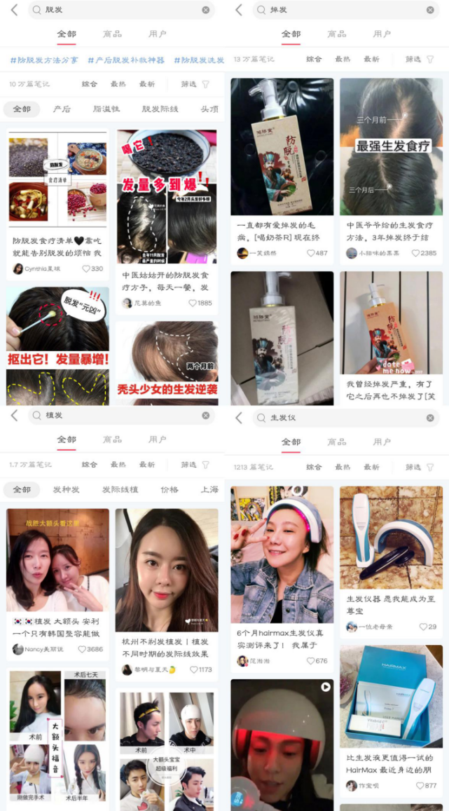 在小红书上以“脱发”、“掉发”、“植发”、“生发仪”等为关键词搜素,分别显示10万、13万、1.7万、1213篇笔记的记录。而微博上#90后脱发活成60后#的话题阅读量达2.5亿,讨论量则达19.7万。