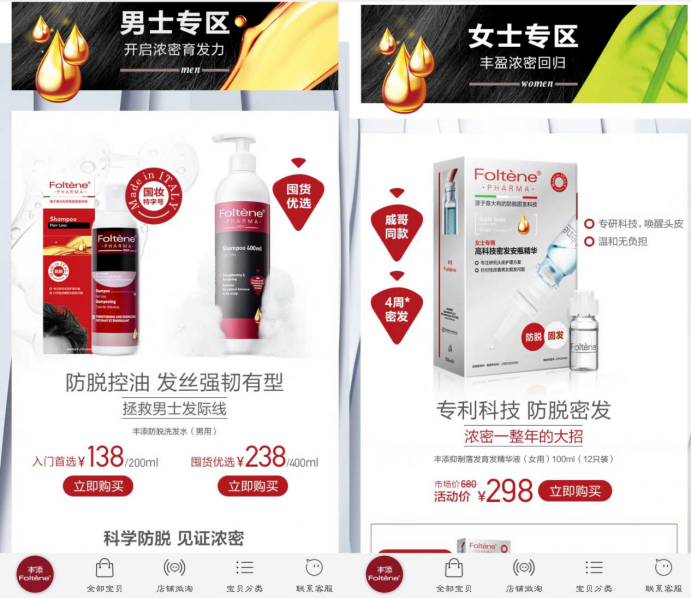 据了解,1981年进军法国市场的丰添,就于首年度创造了丰添防脱发精华素130万瓶的销售佳绩。2007年,丰添进入中国医院和药房渠道,并于2013年在天猫开设旗舰店,其产品特色是,根据男女性别,进行区别护理。