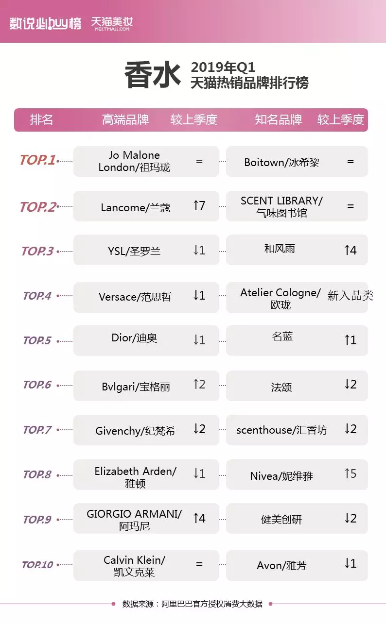 究竟美妆新趋势在哪里?近日,CBNData旗下数说必buy榜联手天猫美妆推出2019年第一季度热销榜。该榜单通过天猫平台非跨境业务品牌于本季度2019Q1和上季度2018Q4销售情况分析得出,给出的天猫热销品牌TOP10分为高端品牌和知名品牌两大维度,前者系天猫业务线所定义的高端品牌,将此单独分析更凸显出线上的高端化趋势,而后者包含天猫业务线所定义的国货品牌、大众品牌、日韩品牌(非高端)和新锐品牌。