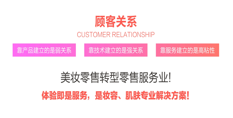体验不仅仅是产品试用,从顾客层面理解的体验就是,期望从导购那里获得更专业的技术以协同解决需求问题,如:皮肤检测,专业解答,体验手法,妆容设计,仪器配合等辅助功能,若能如顾客所愿,那么我们与顾客的关系就是强关系,强关系意味着就不是买卖关系了,而是服务关系了,靠服务建立的关系粘性就高了。