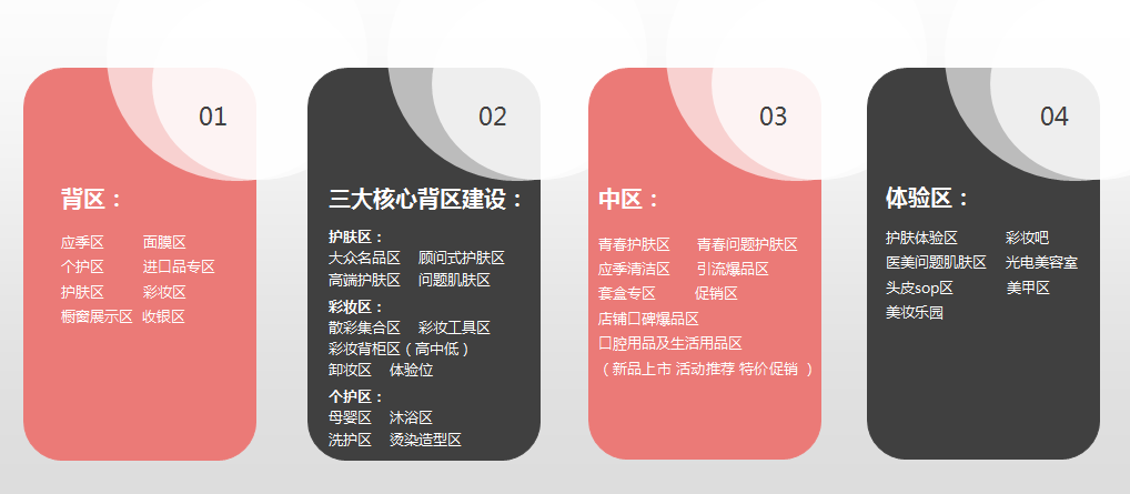 三大核心背区,护肤区(进口护肤品区、顾问式护肤区、高端特护区、问题肌肤区)、彩妆区(散彩集合区、彩妆工具区、彩妆背柜区、卸妆区、体验位)和个护区(母婴区、沐浴区、洗护区、烫染造型区)。