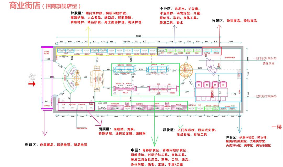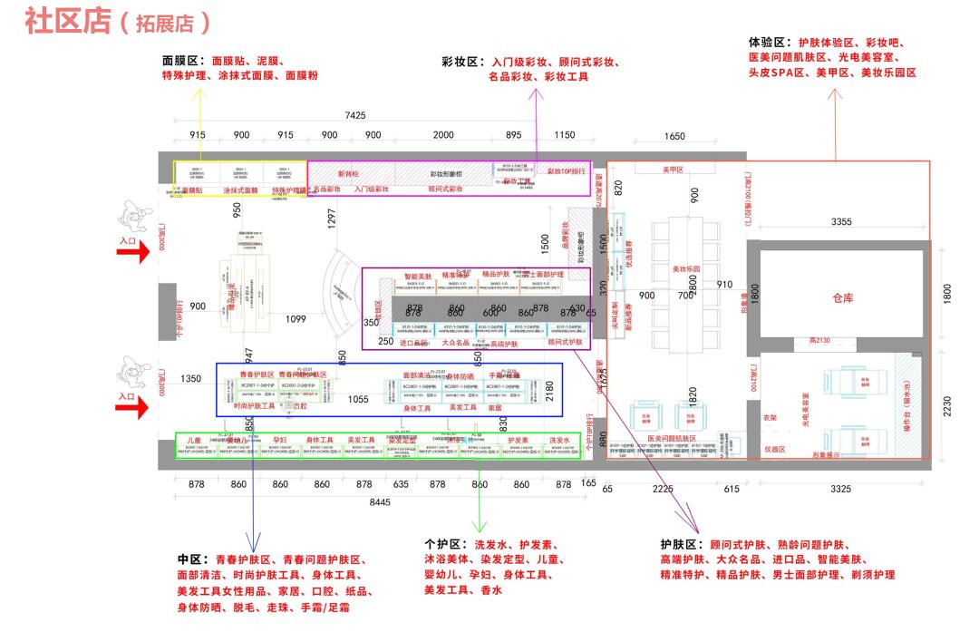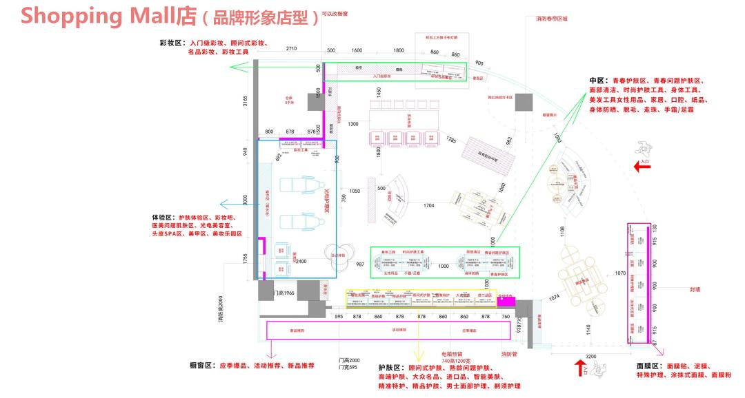 背区,包括应季区、面膜区、护肤区、进口品专区、个护区、彩妆区、橱窗展示区和收银区。