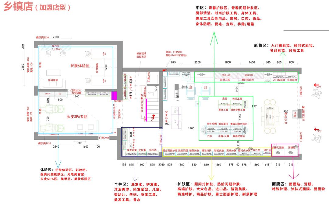体验区,随着店铺零售+项目的模式开启,适合美妆店铺的体验专区根据科学归类共分为七大体验区:1,护肤体验区、2,彩妆吧、3,医美问题肌肤区、4,光电美容室、5,头皮管理专区、6,美甲区、7,美妆乐园。其中,7个体验区可以根据店铺的经营定位不同落地匹配的体验区,如商业街可以1、2、6,社区店可以1、3、5等。