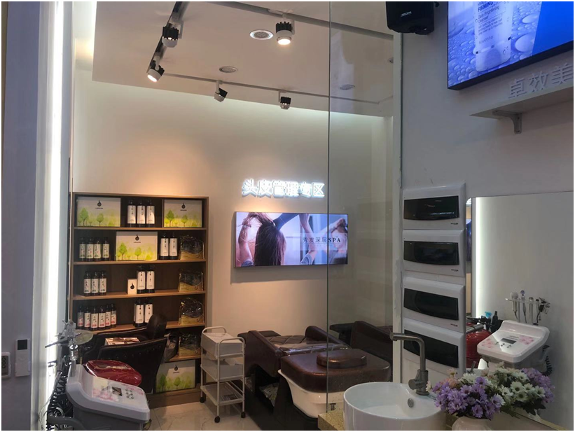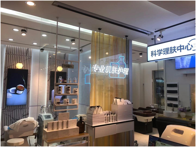 一方面,居民聚集、便利性强的化妆品社区店的店员往往与顾客之间的粘性、互动性更强,他们追求舒适感和专业服务。因此社区店的结构一般径深较大,它预留出房间或者隔间用以体验,体验区宜大,甚至可占据整店近半区域,主要以头皮管理专区,护肤体验区光电美容室为主,以满足中高端消费者的需求。
