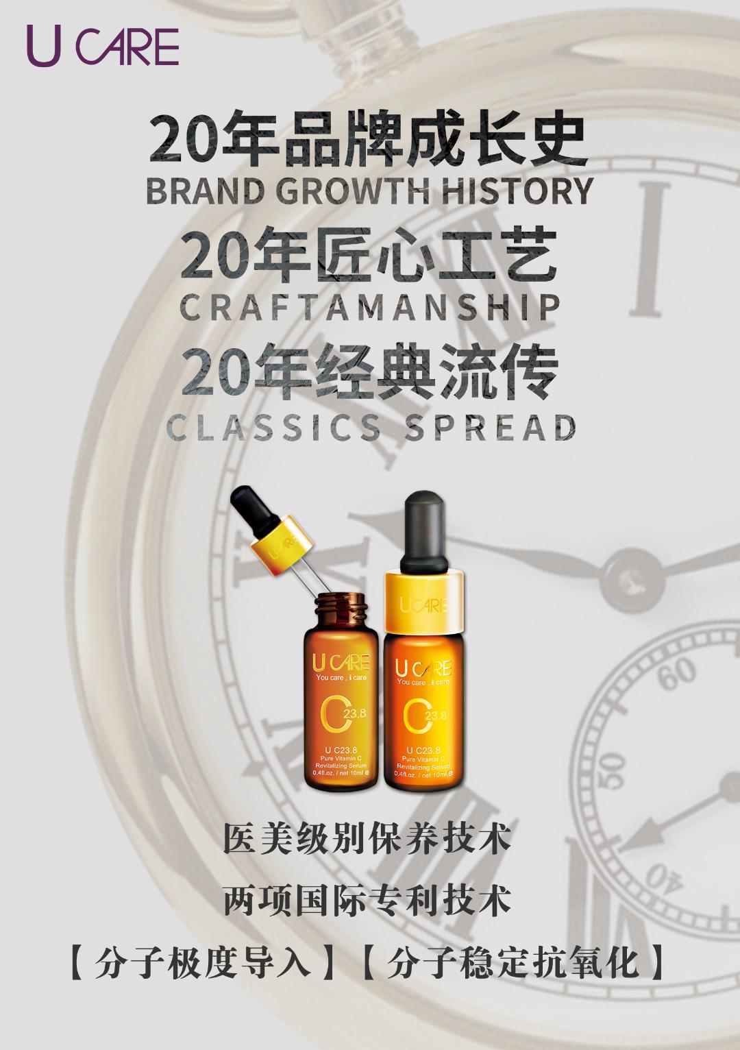U CARE以明星爆品左旋C23.8高浓缩原液而广为人知,2018-2019年连续两年参加台湾TVBS《女人我最大》大赏,便斩获“网友票选新品大赏”、“最佳逆龄精华液赏”、“最佳美眸无痕奖”等三大奖项。尽管10ml就要价1100元,但其在美白、抗衰功效上的卓著效果,仍成为消费者争抢的单品。