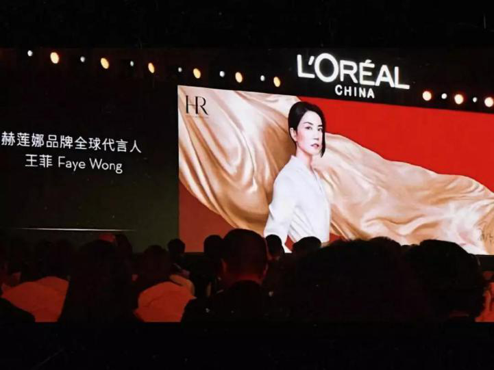 两侧屏幕文字内容为:”赫莲娜品牌全球代言人 王菲 Faye Wong”