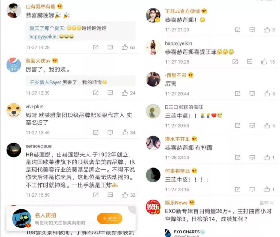 网友的评论却多为“恭喜赫莲娜拿下王菲”,“怎么说服王菲的”。
