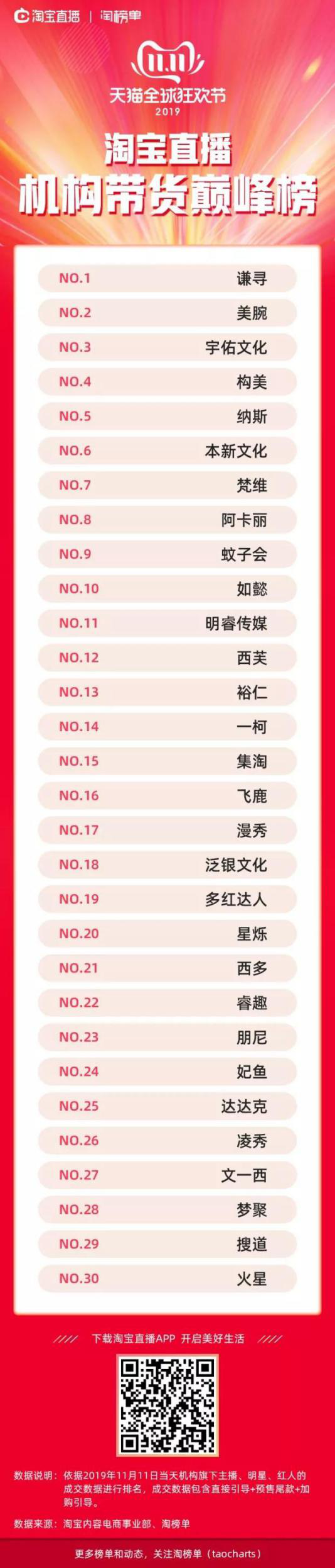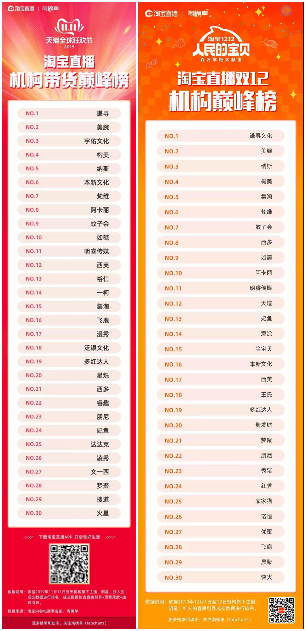 在淘宝直播联合淘榜单发布的双十一“淘宝直播机构带货巅峰榜TOP30”中,我们可以清楚地看到,“淘宝一姐”薇娅所属直播机构“谦寻”蝉联第一,其次是“口红一哥”李佳琦所在的直播机构美腕位列第二。