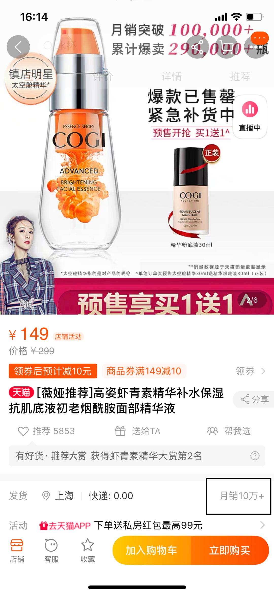 与此同时,高姿还和“淘宝一姐”薇娅达成深度合作,为产品的热销奠定基础。数据显示,在薇娅直播2分钟内,高姿“太空舱精华”便售出了2万+,销售额200万+。