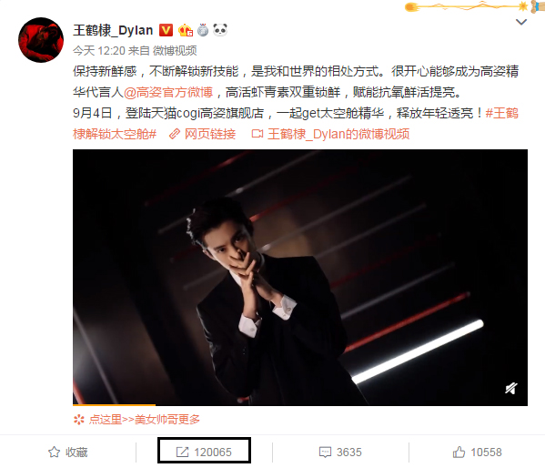 为了更好地塑造产品力,2019年9月4日,高姿签下新生代偶像代表王鹤棣作为精华类产品代言人,并打出“高人气偶像+黑科技护肤”的组合,凭借着新生代明星强大的粉丝经济,为高姿赢得了不少人气,在王鹤棣代言官宣的微博发布不久,便获得了12万的转发量。