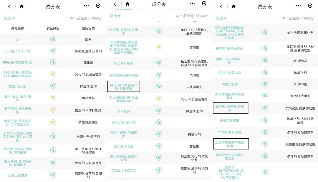 除此之外,产品还添加了专利提亮精粹和三重酵母精粹多种护肤成分,以及二裂酵母发酵产物溶胞物、酵母提取物等雅诗兰黛小棕瓶和兰蔻小黑瓶中使用的活性成分,在达到抗氧化提亮美白的同时,弱化角质,减少皮肤出油等问题。
