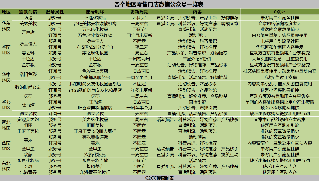 据C2CC传媒此前在《零售门店如何借助公众号聚焦内容化转型?》一文中指出,美林美妆、金梦妆、亿莎、美之约、欢颜等的服务号与金甲虫的更新频率均是每周一更,而巧遇、万色店、时尚女友等的服务号更新时间不固定,它们的阅读数相较金甲虫会低很多,从几千到几万不等。推文主要是活动预告/秒杀、科普常识、好物推荐,有的还有直播引流、鸡汤好文等几大板块,这样的内容组合相对合理,单调的内容输出会让用户心生厌倦。