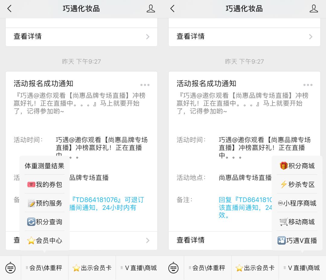 巧遇的服务号同样拥有卡券、会员制等会员管理服务,用杨隆波的话说,“门店和顾客持续地发生利益关系,是增强微信吸客持久力的关键”;而内容上,巧遇会定期策划微商城活动,并通过公众号、朋友圈进行传播导流;服务号的菜单栏同时也缀有微商城、小程序商城和微赞直播等多个入口。