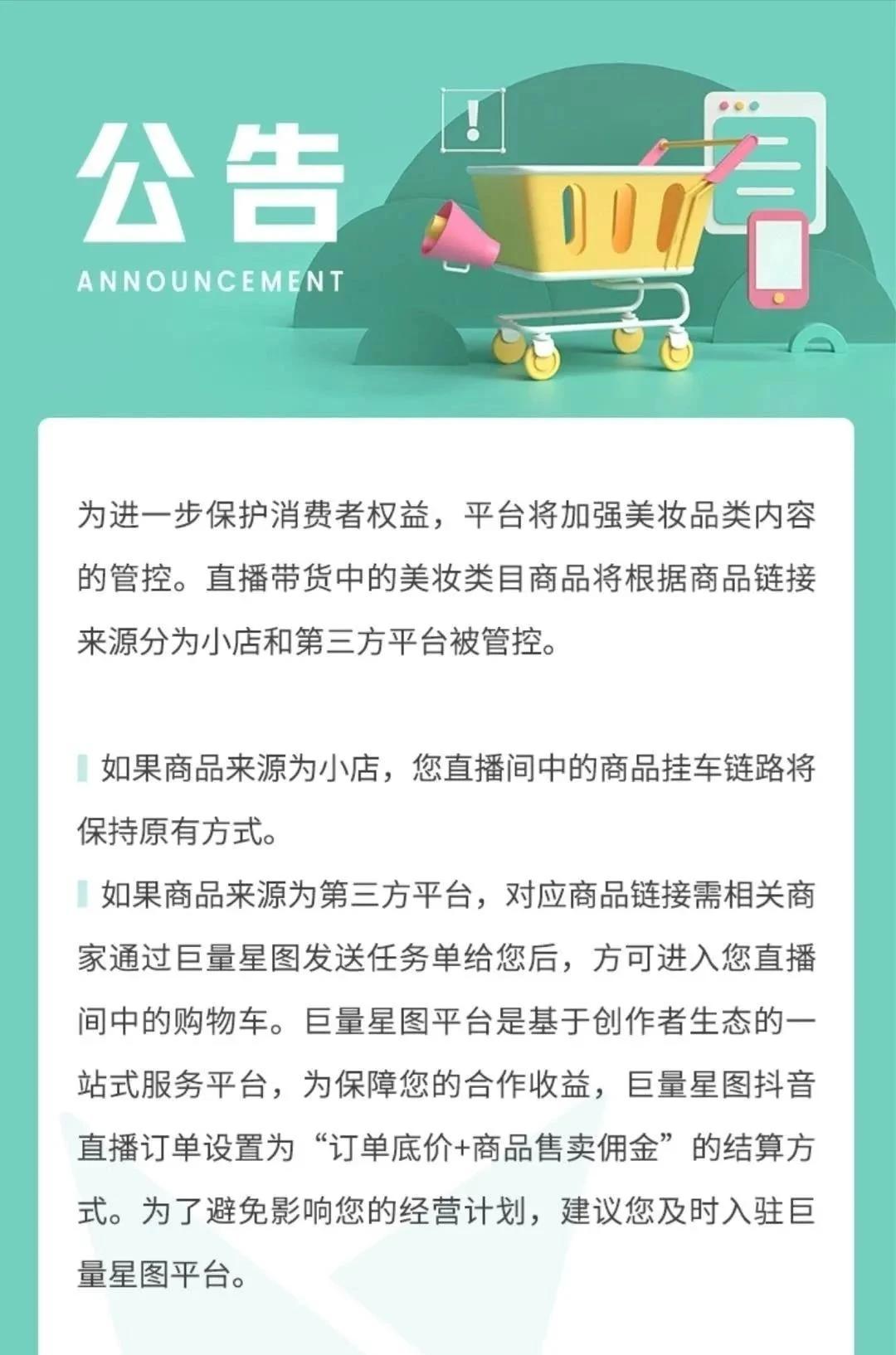 7月30日,抖音发布了《美妆个护新规》,据公告称,从8月6日起,第三方平台来源的美妆个护商品直播分享需要通过巨量星图平台匹配直播带货达人,小店平台来源商品不受影响。