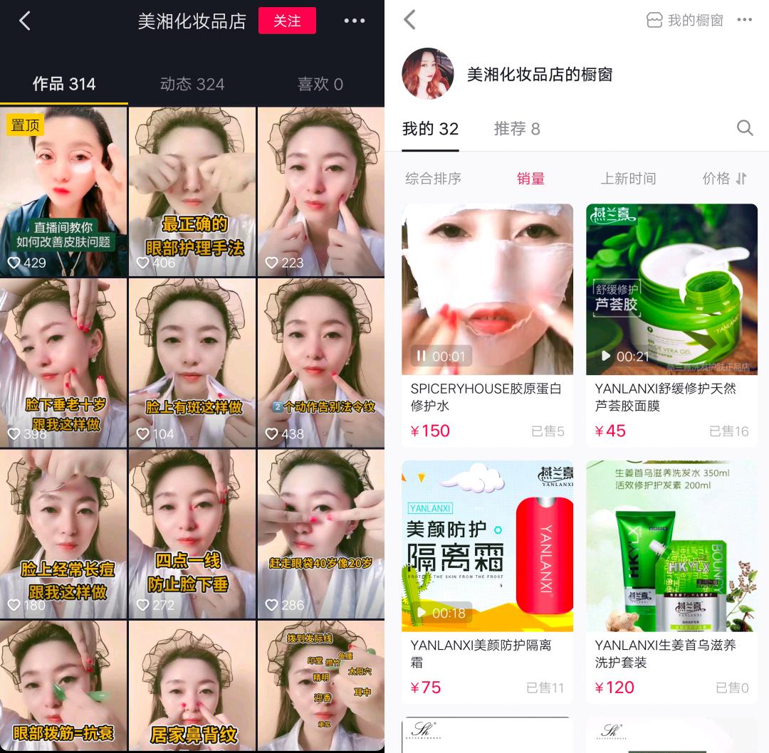 而拥有49.6W粉丝的美湘化妆品店抖音号内容,则是以护肤手法和分享如何改善皮肤问题为主,从互动层面来说,不少消费者被其护肤手法吸引,但从抖音小店的销售量来看,高则16,低则0,虽然有变现,但也是较低的量。