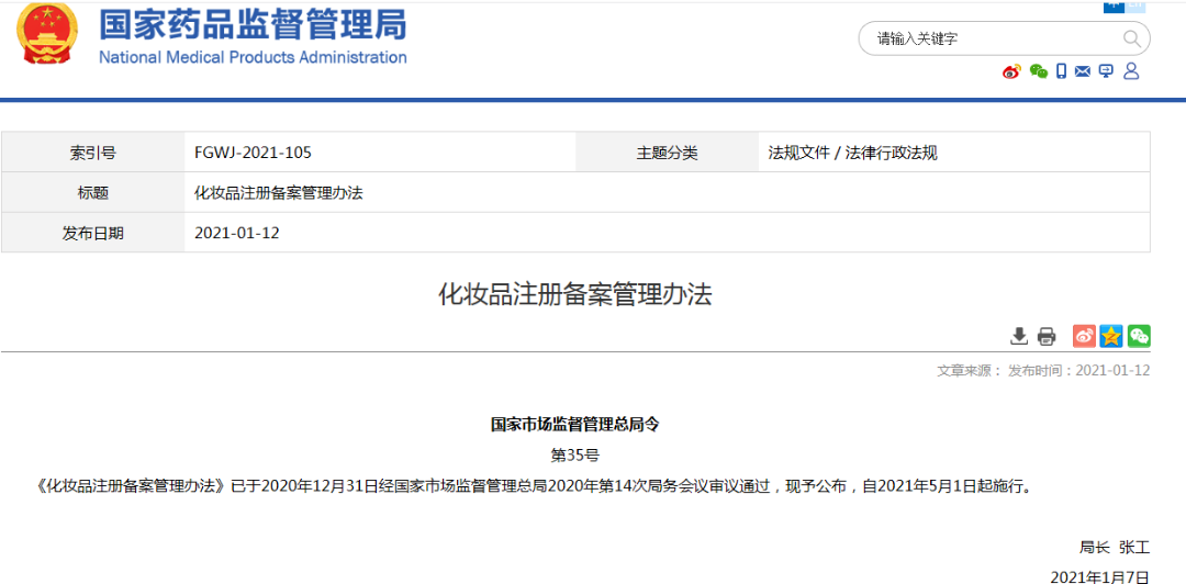1月12日,国家市场监督管理总局发布《化妆品注册备案管理办法》(以下简称《办法》),自2021年5月1日起施行。《办法》共六章63条,对化妆品新原料注册和备案管理、化妆品注册和备案管理、监督管理、法律责任等各方面均作出明确规定。《办法》进一步细化了化妆品注册备案管理规定,可以说,是《条例》最为重要的配套文件。