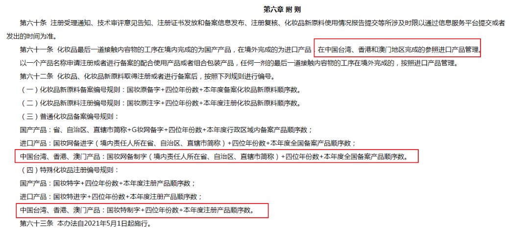 此外,根据《办法》第六十一条:化妆品最后一道接触内容物的工序在境内完成的为国产产品,在境外完成的为进口产品,在中国台湾、香港和澳门地区完成的参照进口产品管理。