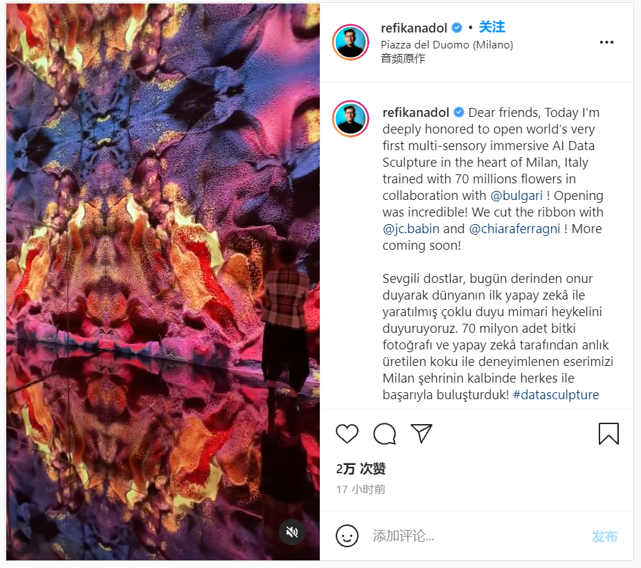 意大利奢侈珠宝品牌 BVLGARI(宝格丽)近日在米兰联手土耳其新锐多媒体艺术家兼导演 Refik Anadol 打造了一件数字视觉艺术装置。