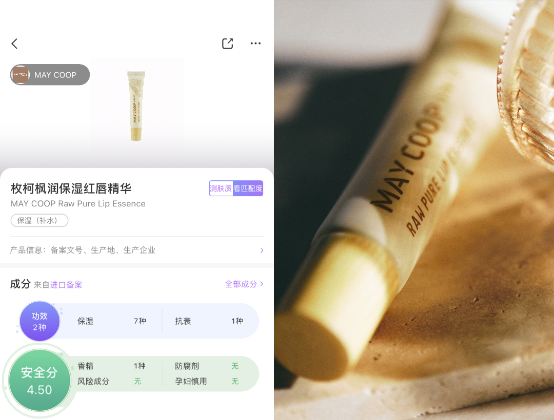 枚柯枫润保湿红唇精华就是一款无风险成分、防腐剂、孕妇慎用成分添加的唇部护理产品,经化妆品成分查询app美丽修行4.5全绿配方认证,即使是唇部易敏感人群也可放心使用,真正做到0敏护唇。
