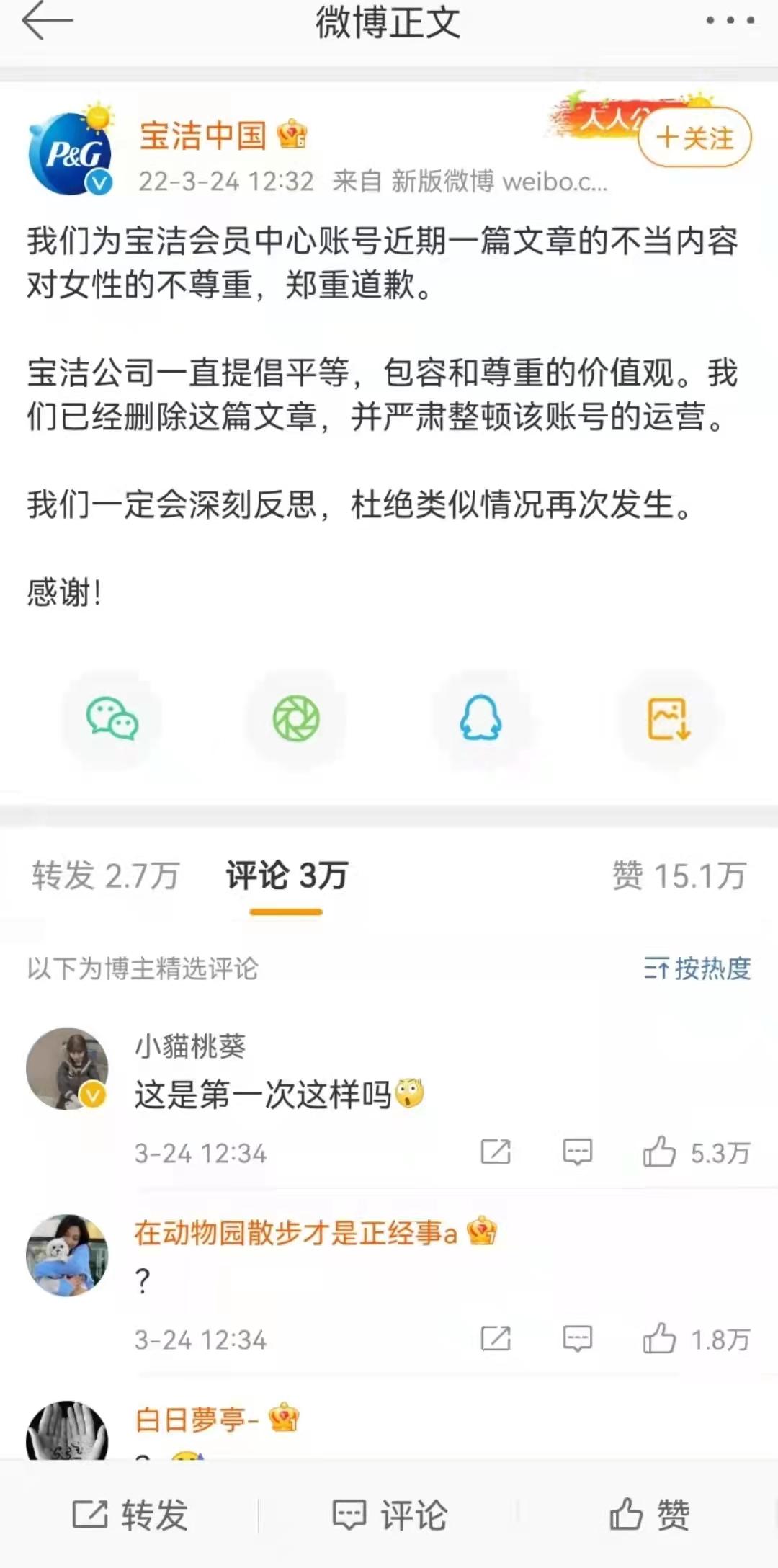 就在近日,曾经的品牌营销教科书宝洁也在近期推广营销中引起了巨大的争议。3 月 24 日中午,宝洁会员中心发布的推文《你对女人的臭一无所知!》被指侮辱女性,#宝洁道歉#登上微博热搜。随后宝洁会员中心删除推文,并在微博上通过宝洁中国官方账号道歉。但就微博下方评论看,用户对此并不买账(详细报道可戳C2CC传媒X新妆资讯相关报道《科普带货翻车?宝洁致歉!》)。