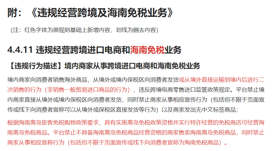 其三,平台禁止不具备海南离岛免税商品经营资格的商家售卖海南离岛免税商品,同时禁止商家从事相应宣称行为(包括但不限于页面宣传或线下向消费者宣称为海南免税商品)。