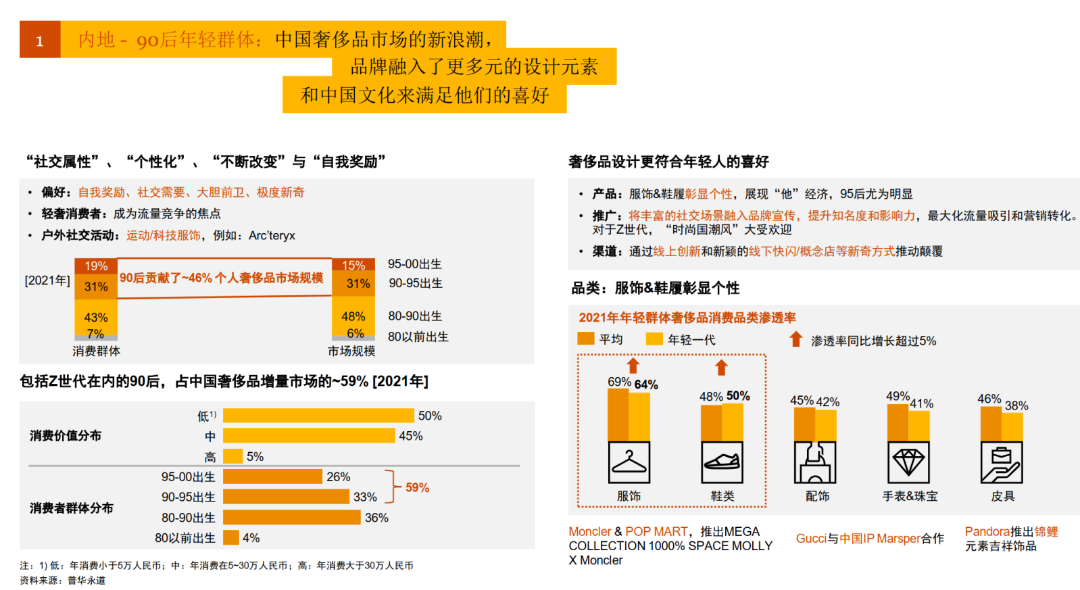 普华永道发布的《中国内地及香港地区奢侈品市场洞察:“重塑客户价值,实现可持续增长”》报告数据显示,2021年90后贡献了46%的个人消费品市场规模,作为轻奢爱好者,他们更注重社交属性,个性化,不断改变以及自我奖励,他们大胆前卫,极度新奇,是流量竞争的焦点。