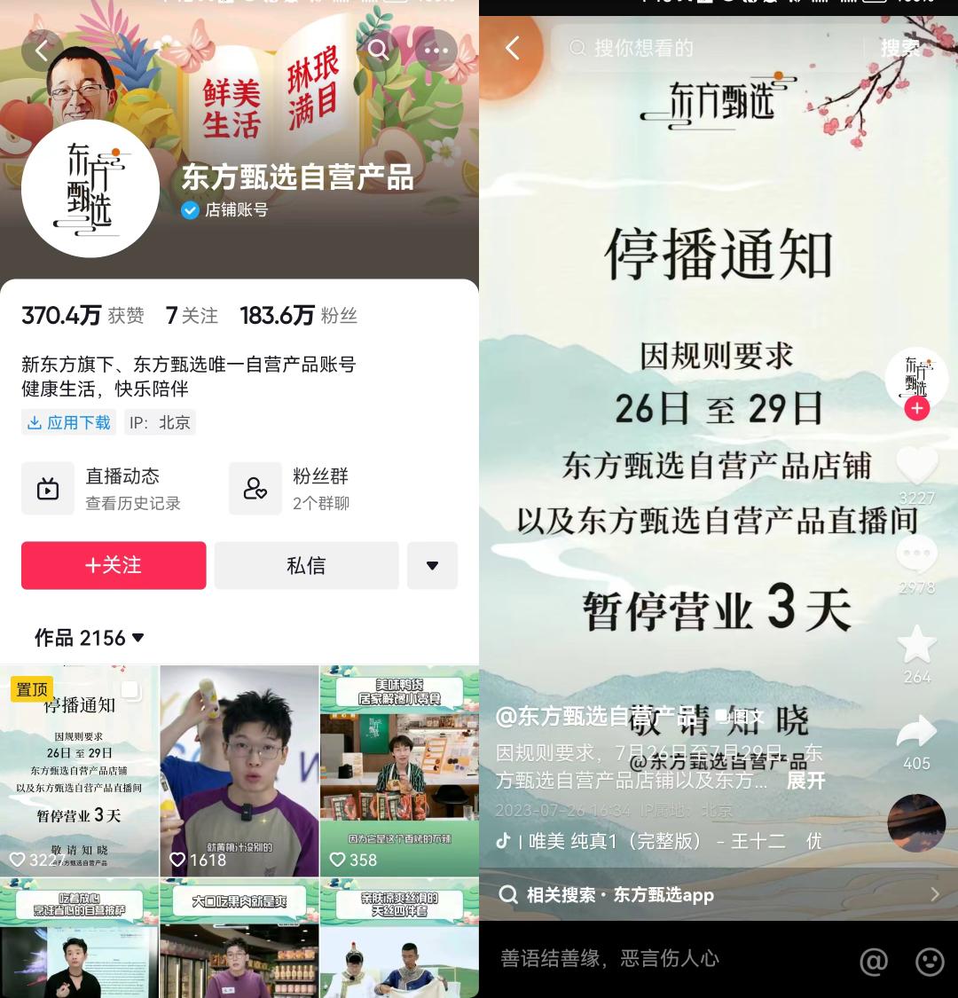 7月26日,抖音直播间“东方甄选自营产品”发布停播通知:“因规则要求,26日至29日,东方甄选自营产品店铺以及东方甄选自营产品直播间暂停营业三天。”