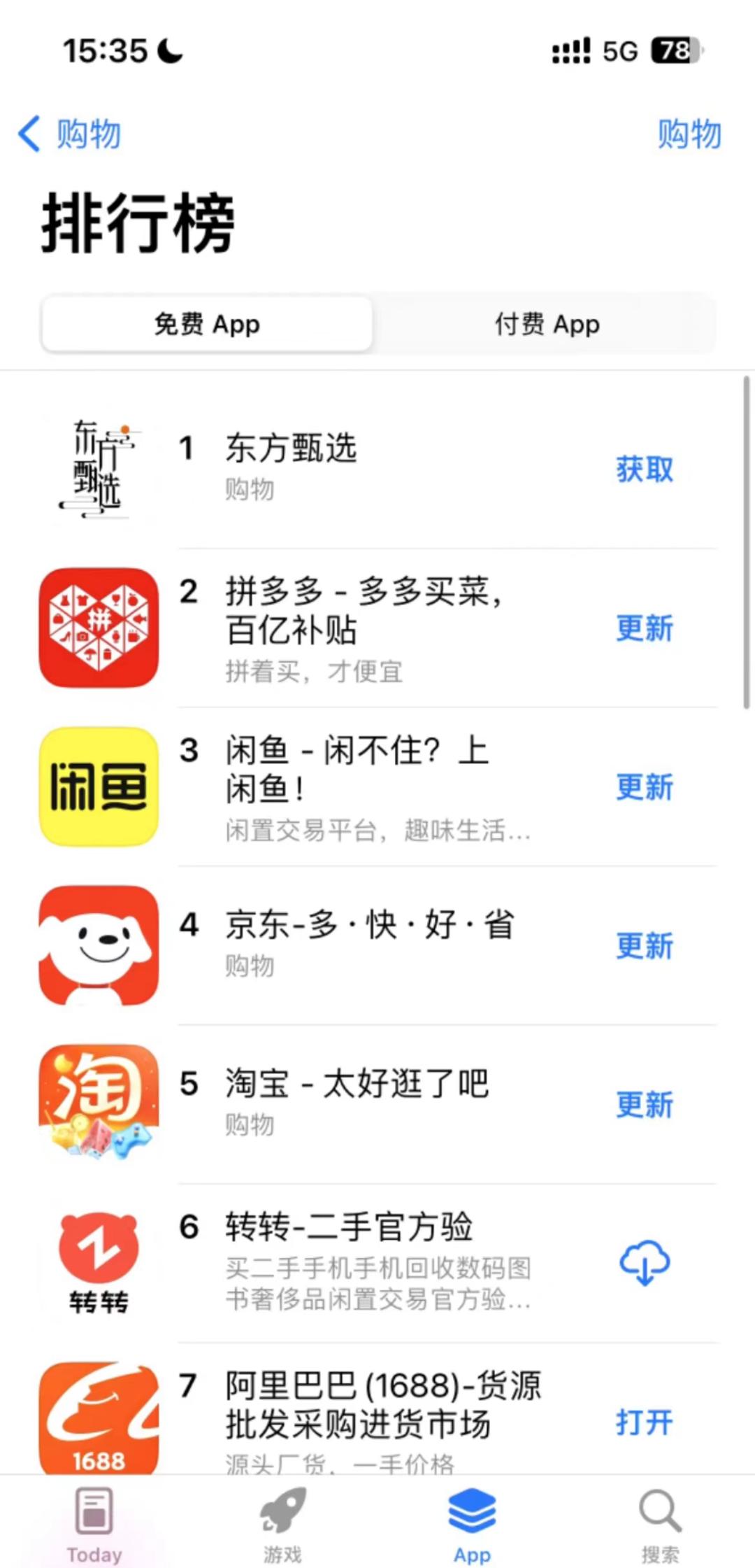 就在东方甄选直播间被关原因曝光后以及在打折消息刺激下,东方甄选App下载热度持续攀升,今日登上了苹果App Store应用商店购物榜第一,超越众多竞品。