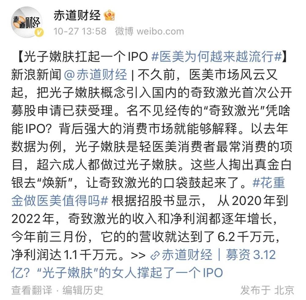 奇致激光,被光子嫩肤撑起的IPO。(图/@赤道财经)