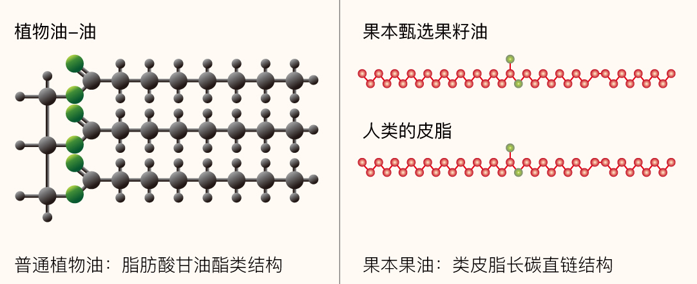 不同于普通植物油的脂肪酸甘油酯类结构,果本从大自然珍稀果实中提取的果油,具有类皮脂长碳直链结构,与人体皮脂相似度达97%以上,亲肤性更好,安全性更高。