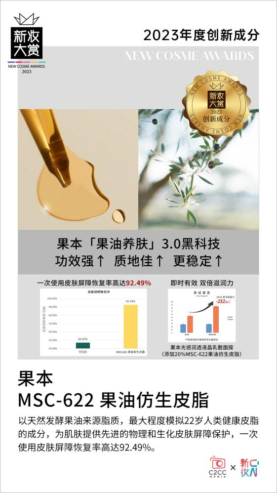 在此基础之上,拥有独家专利成分更能打造核心竞争力,筑牢品牌科技壁垒。果本科研团队首创研发出了一项独家专研专利成分——MSC-622果油仿生皮脂。