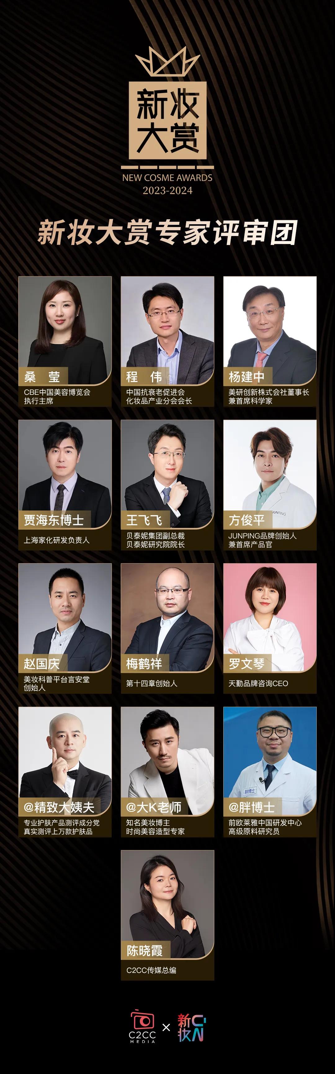 为确保评选的客观公正,C2CC传媒&新妆邀请到了CBE中国美容博览会执行主席桑莹;中国抗衰老促进会化妆品产业分会会长程伟;美研创新株式会社董事长兼首席科学家杨建中;上海家化研发负责人贾海东博士;天勤品牌咨询CEO罗文琴;专业护肤产品测评成分党、真实测评上万款肤品、深耕护肤垂类行业17年@精致大姨夫等涵盖研发大拿、行业专家、头部KOL等诸多行业大咖,共同参与此次年度奖项的评选,从多个维度公正客观地评选。