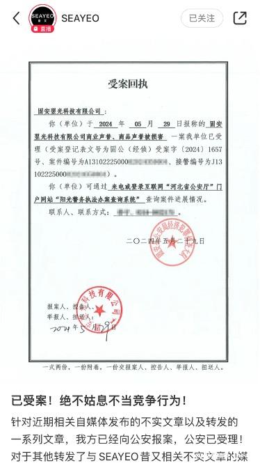5月24日seayeo昔又品牌大排灯被质疑“蓝光不合格”,随后极萌在其电商平台旗舰店挂出对比介绍称,“昔又大排灯蓝光危害视网膜,极萌大排灯蓝光0危害。”5月29日,昔又发布“没错,这就是商战”的文章,直指极萌“涉嫌编造、传播误导性信息、恶意竞争”。昔又客服向记者表示,当前公安已经受理了案件,有结果后会发通知。5月30日,Jmoon极萌公关部回应昔又的信息不实,“会通过法律程序维护自身权益。”