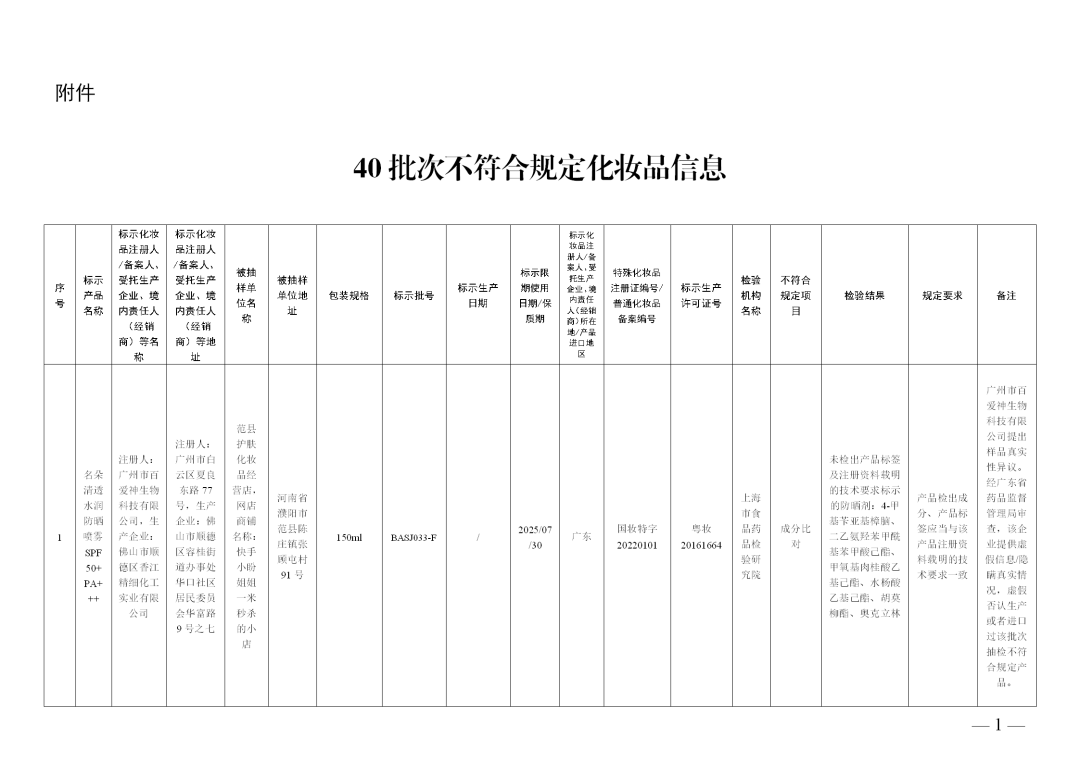 国家药监局网站12日发布通告,通告称:在2023年国家化妆品抽样检验工作中,经上海市食品药品检验研究院等单位检验,产品标签标示注册人为广州市百爱神生物科技有限公司、生产企业为佛山市顺德区香江精细化工实业有限公司生产的名朵清透水润防晒喷雾SPF50+ PA+++等40批次化妆品不符合规定。