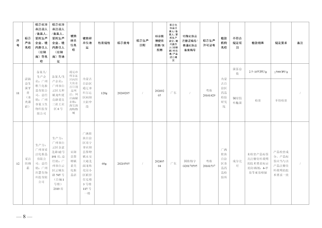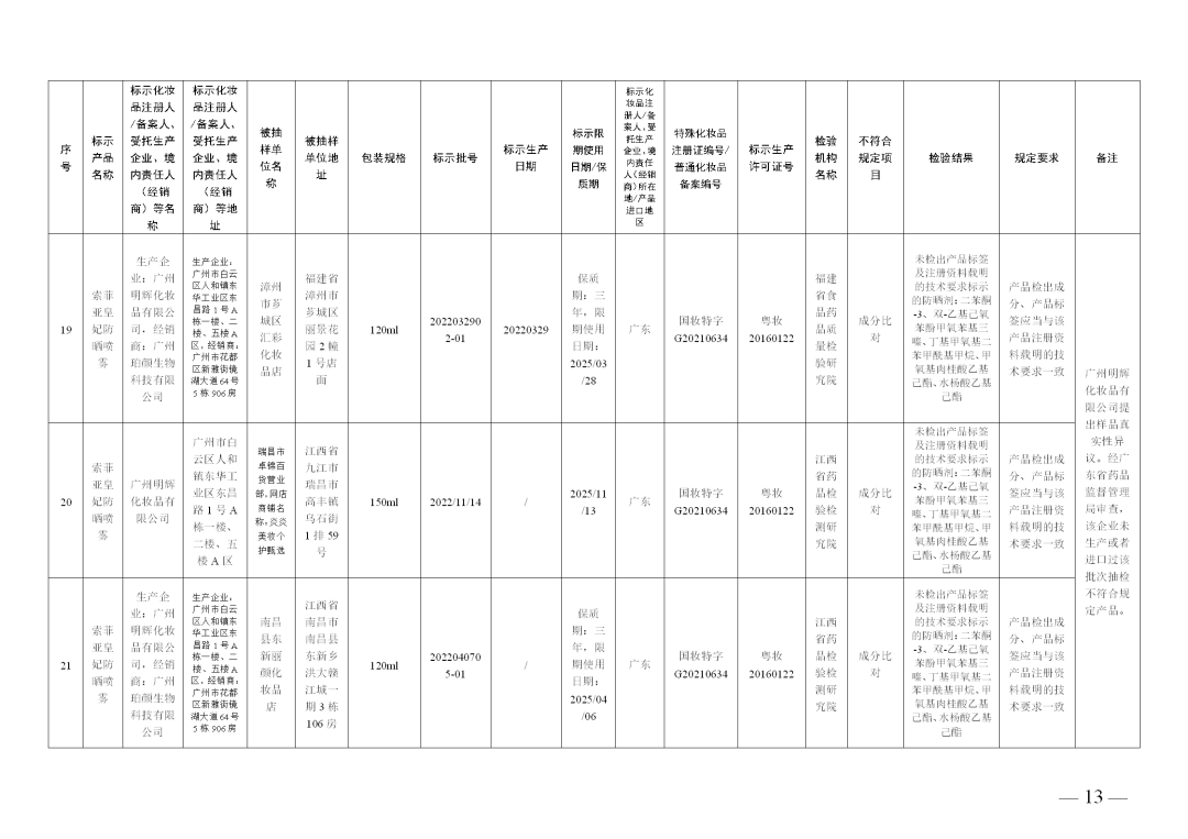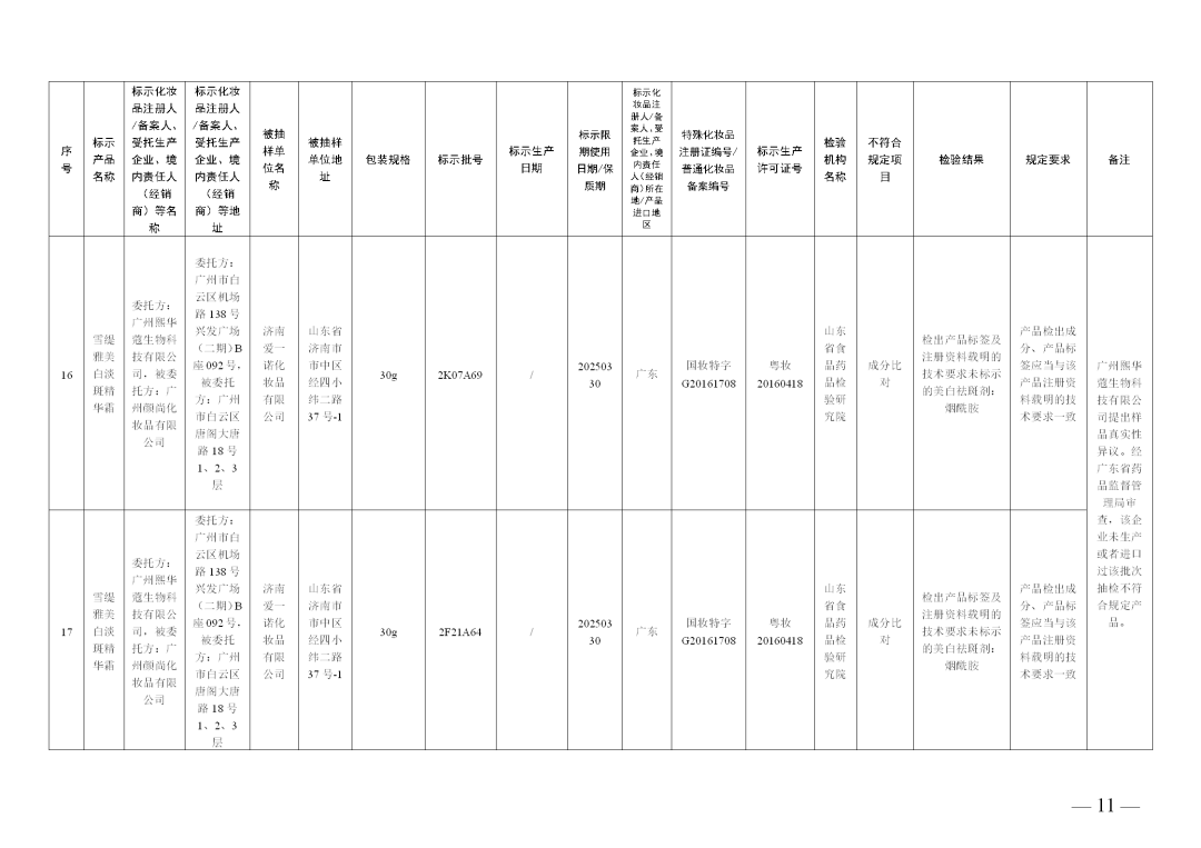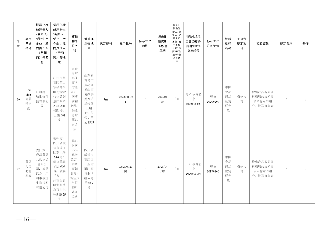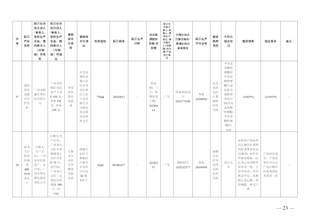 其中,广州市百爱神生物科技有限公司提出样品真实性异议申请,经广东省药品监督管理局审查,被抽检不符合规定的产品确为上述生产企业注册或生产。上述企业提供虚假信息、隐瞒真实情况的行为属于《化妆品监督管理条例》规定的情节严重的情形,查实后将依法从重从严处罚。
